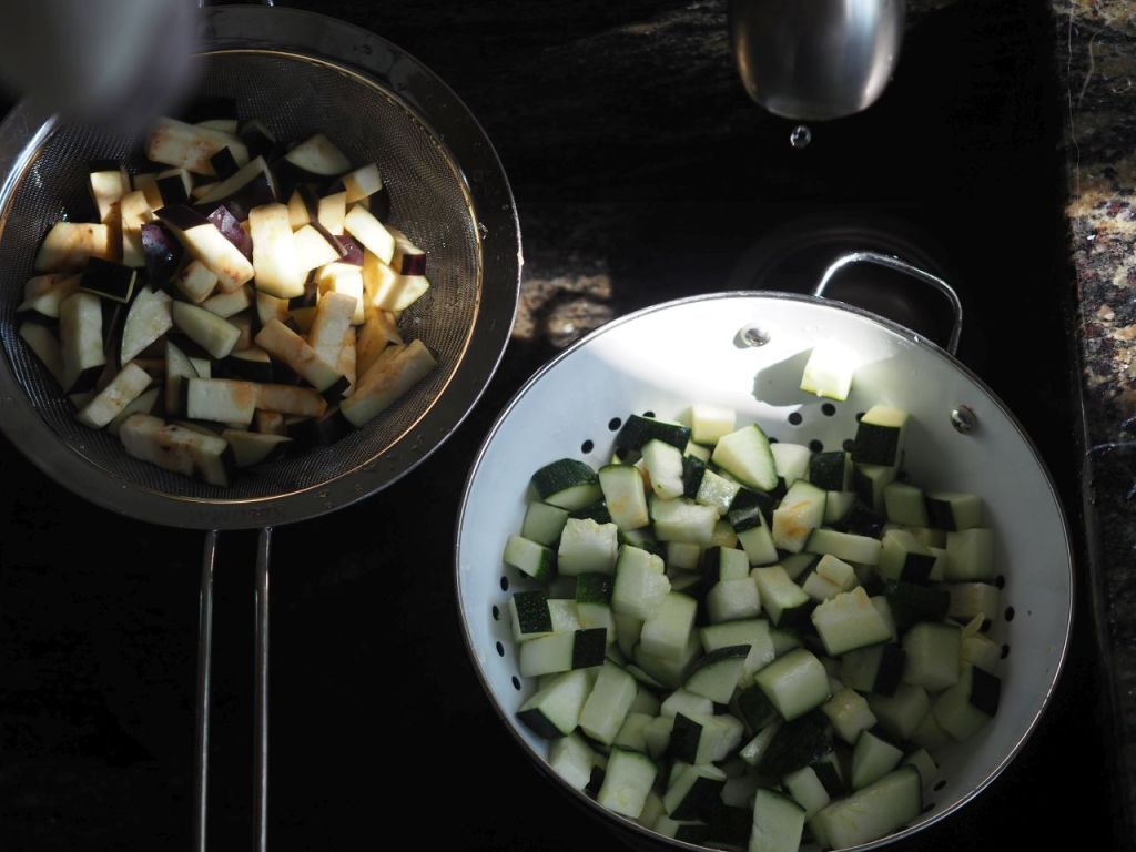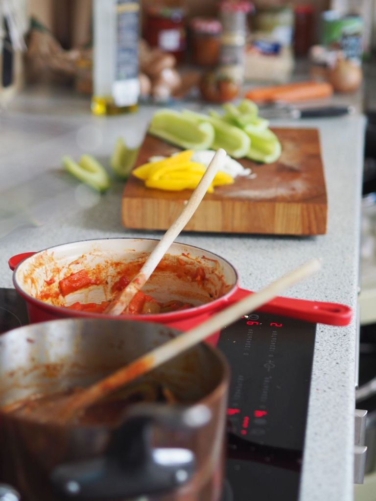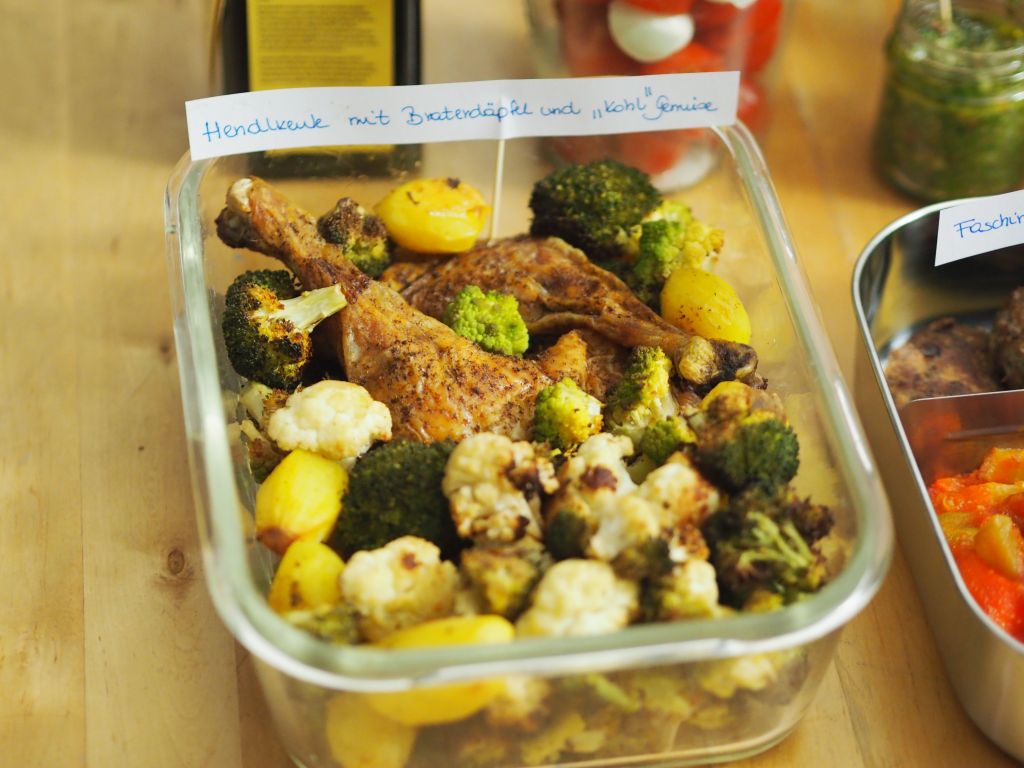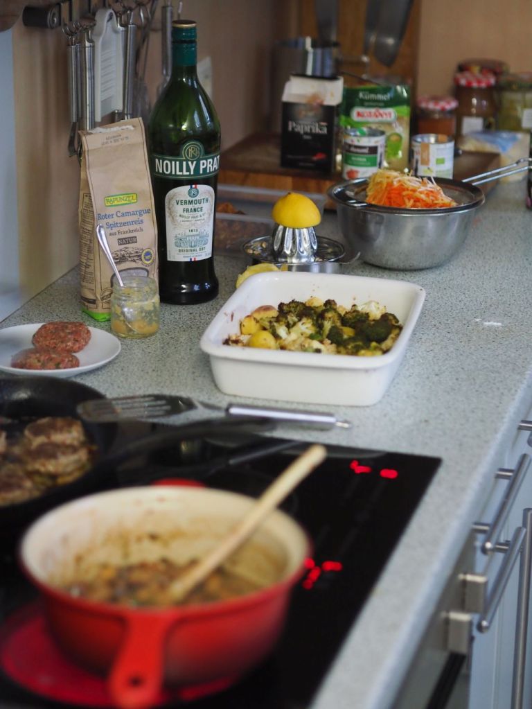 Kürbis für die Kürbissuppe, gegrillte Paprika, Karfiolreis, sowie rote und gelbe Navetten wurden im Backrohr mit dem Braten gleichzeitig gegart, um Strom zu sparen. Das wird alles nächste Woche verwendet.