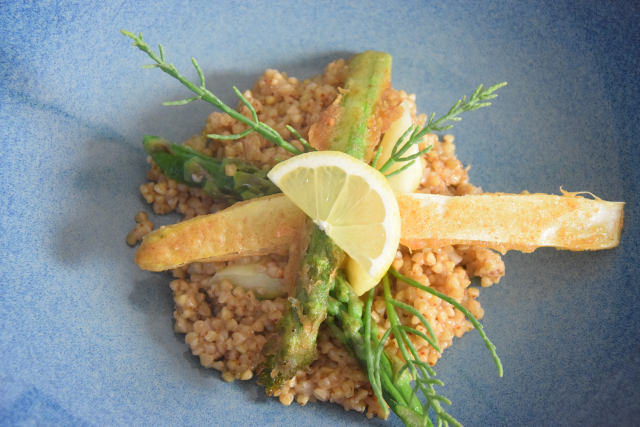 Buchweizen wird gedünstet und mit Tonkabohnen abgeschmeckt. Eine Hälfte des Spargels wird in Tempurateig frittiert, die andere in Butter mit Parmesan geschwenkt.
