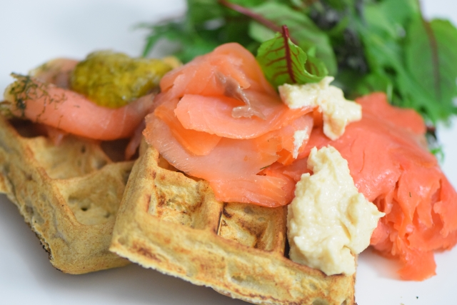Von Hadn-Platln zu Hadn-Waffeln. Waffeln aus Buchweizen mit einer Topfenterrine mit eingesprenkelten Chili und grünem Pfefferkörnen und zu scharfe Kirschtomaten.