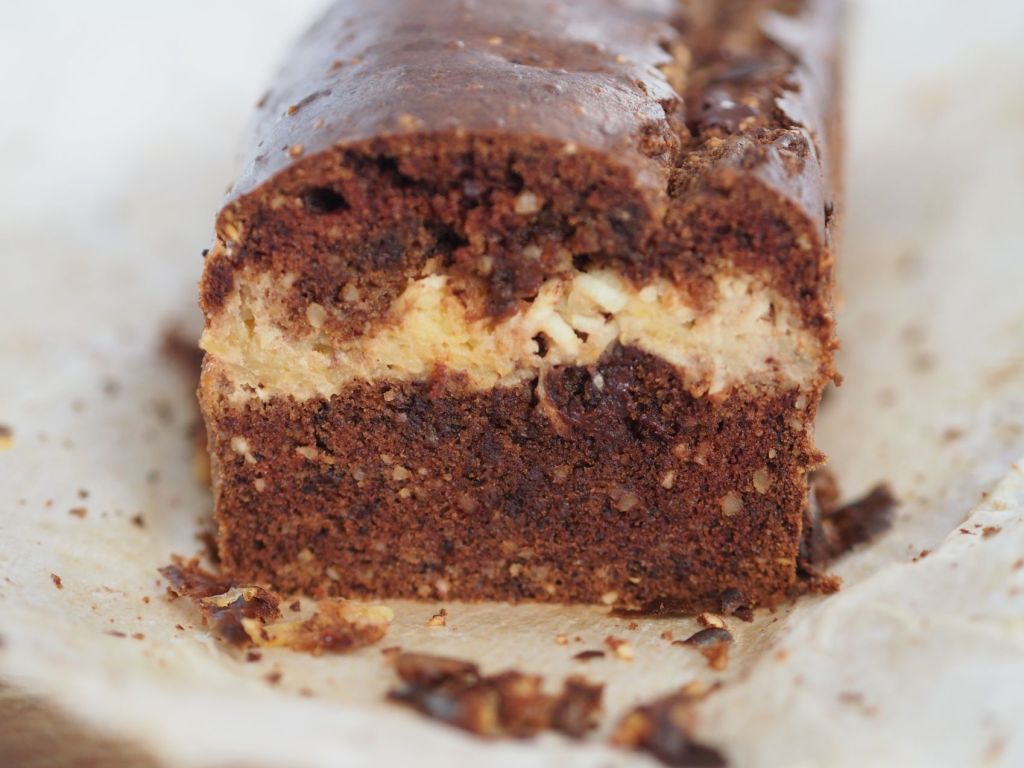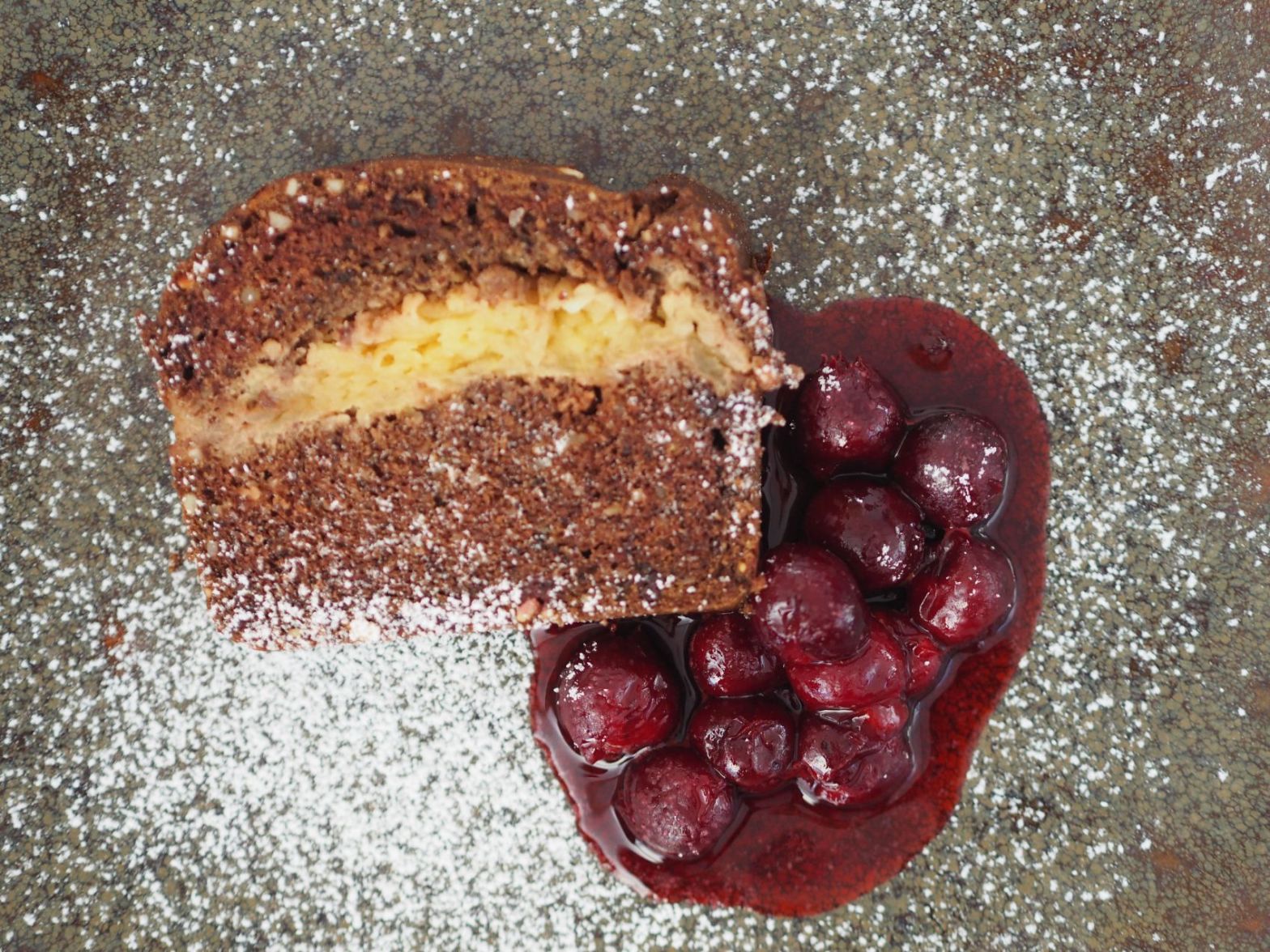200 g auf Zimmertemperatur gebrachte Teebutter mit dem Ausgekratzten einer Vanilleschote in eine standfeste Teigschüssel geben und mit dem Handrührgerät schaumig rühren. Fünf Eier trennen, die Dotter einzeln in die Butter einarbeiten. Dann 80 g Sukrin Melis dazugeben und weiterrühren. Dann 100 g geriebene, neunzigprozentige Zart-Bitterschokolade, 75 g geriebene braune (d.h. mit Haut) Mandeln, 75 g geriebene Haselnüsse zur Butter-Ei-Mischung dazugeben und ein paar Minuten verrühren. Das Eiklar zu steifem Schnee schlagen und den Eischnee vorsichtig mit dem Gummihund unterheben, damit der Schnee nicht zergeht. Und dann zum Schluss 150 g Buchweizenmehl portionsweise mit dem Gummihund unterziehen. Zwei geschälte, vom Gehäuse entledigte Äpfel reiben. Eine mit Backpapier ausgelegte Kastenform mit der einen Hälfte der Teigmasse auslegen, die geriebenen Äpfel darauf verteilen, dann die zweite Hälfte der Teigmasse darauf verteilen, inklusive dem aus der Teigschüssel mit dem Gummihund herausgeschabten, letzten Rest. Bei 180 Grad 25 Minuten backen. Anschließend mit Alufolie abdecken. Weitere 20 Minuten backen. Dazu mit Marsala und Gelierzucker verrührte und eingeköchelte Sauerkirschen servieren.
