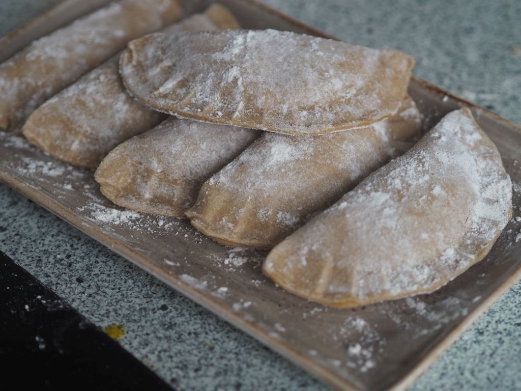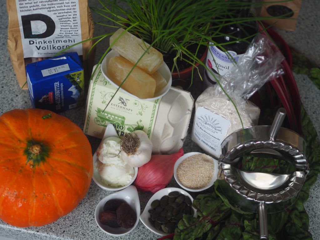 100 g Buchweizenmehl, 50 g Weizenvollkornmehl, 1 ½ Ei zu einem geschmeidigen Teig kneten. Das andere ½ Ei wird später für den Teig bekleistern verwendet. In Frischhalte Folie wickeln und eine stunde im Kühlschrank ruhen lassen. I n d e r Z w i s c h e n z e i t die Füllung zubereiten: Fein gehackte Zwiebel in 1 EL Rapsöl anschwitzen. 3 Mangoldblätter kleinschneiden. Zu den Zwiebeln geben, ein paar Minuten mitschwitzen, vom Herd nehmen und auskühlen lassen. Dann 2 TL Haferkleie und 80 g Topfen dazugeben und gut durchrühren.