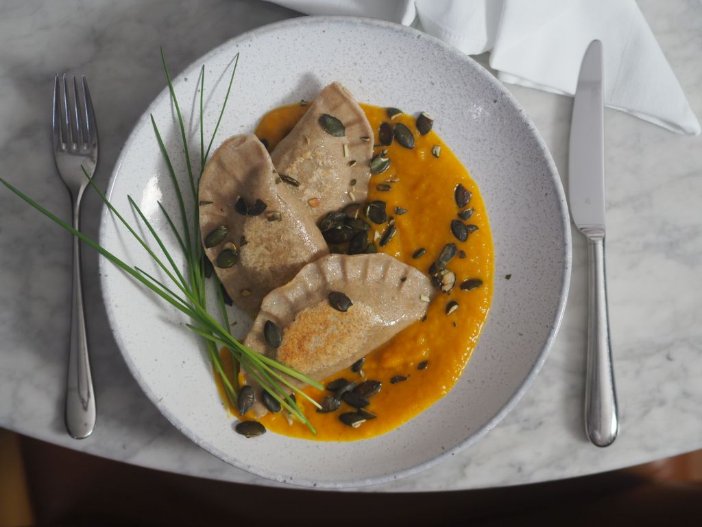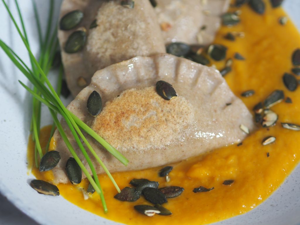 Buchweizen-Maultaschen mit Mangoldfüllung und Kürbis-Aprikosen-Soß
