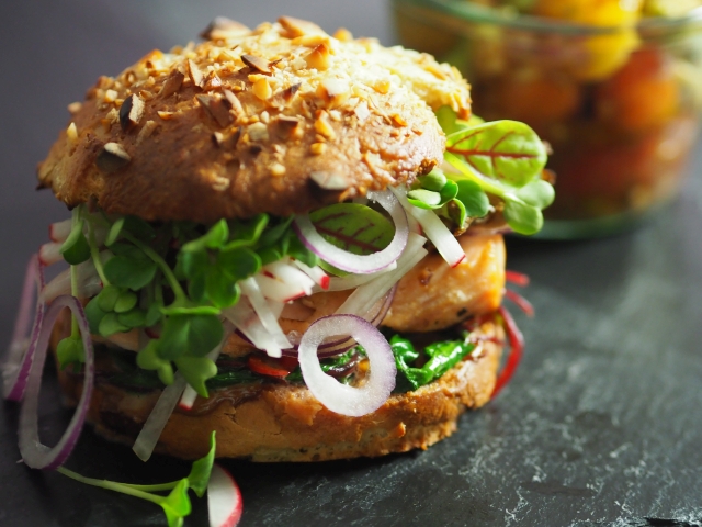 Saftiger, gegrillter Spezial-Royal-Burger, mit Macadima Buns. Keine Kleinigkeit, nichts für schwache Nerven, Anpatzfaktor 10. Der Lachs wird in einer Marinade aus Soja-Sauce, Ponzu-Sauce mit Chili, etc. eingelegt, anschließend in der Pfanne gegrillt. Die Buns werden mit einer japanischen Haselnuss-Sauce bestrichen und ebenso gegrillt. Dazu kommen Radieschen, Austernpilze, Mangold… Wir sind auf den Burger gekommen.