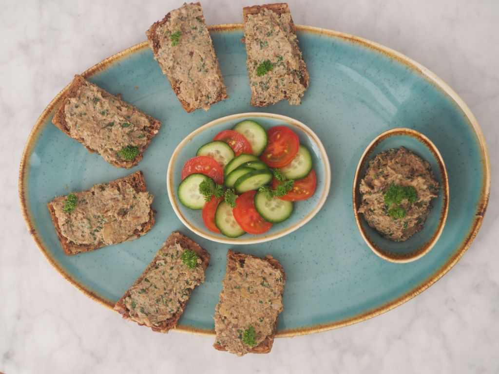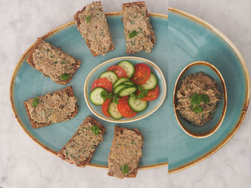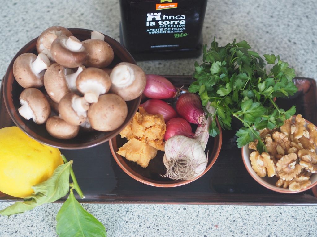 Rote Zwiebeln in dickere Scheiben schneiden. Braune Champignons vierteln, die rote Paprika entkernen, die Haut mit dem Sparschäler abziehen und in Rauten schneiden. In der Schale vorgekochte Erdäpfeln schälen und in Scheiben schneiden. In einem Topf mit wenig Olivenöl die Zwiebeln auf mittlerer Hitze langsam anschwitzen, gleichzeitig dazu die Champignons auf höherer Hitze ohne Fett anbraten. Die Paprika ebenfalls auf mittlerer Hitze mit etwas Olivenöl anschwitzen und mit den Champignons zu den Zwiebeln geben. Dann die Erdäpfelscheiben auch in der Pfanne mit wenig Olivenöl beidseitig schön anbraten, parallel dazu die Pattys in eine Bratpfanne geben und bei hoher Hitze beidseitig braten. Misosauce: Misopaste, Mandelmus mit Zitronensaft und geriebener Zitronenschale und Wasser, damit es cremiger wird, zu einem Dip zusammenrühren. A n r i c h t e n mit Petersilie und Micro Greens.