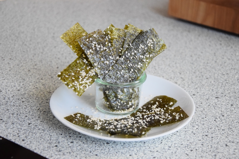 Mit Tomaten-Mayonnaise und Grünkohl- und Süßkartoffel-Chips. Dazu Salat mit Stangensellerie, Gurken und Salatherzen. Das Jalapeno-Ketchup wurde nicht selbst gemacht, sondern ausnahmsweise gekauft, war aber beeindruckend gut. Aus St. Pölten von Fireland Foods. Mit Garnelen aus Hall in Tirol, Rindfleisch aus dem Tullnerfeld in Niederösterreich, gekauft in Wien.