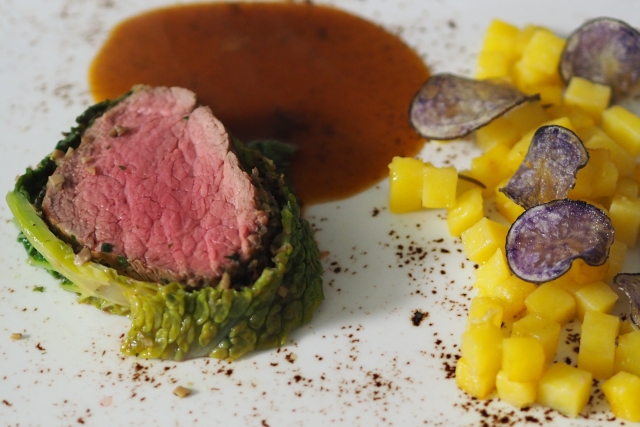 Paprika und Tomaten für das Ratatouille werden über Nacht in Olivenöl eingelegt, damit sich die Aromen in aller Ruhe entfalten können. Der Kaninchenrücken wird kurz angebraten und dann nochmal, wenn er mit Prosciutto ummantelt ist, damit sich Röstaromen entwickeln können. Man muss das Leben genießen.