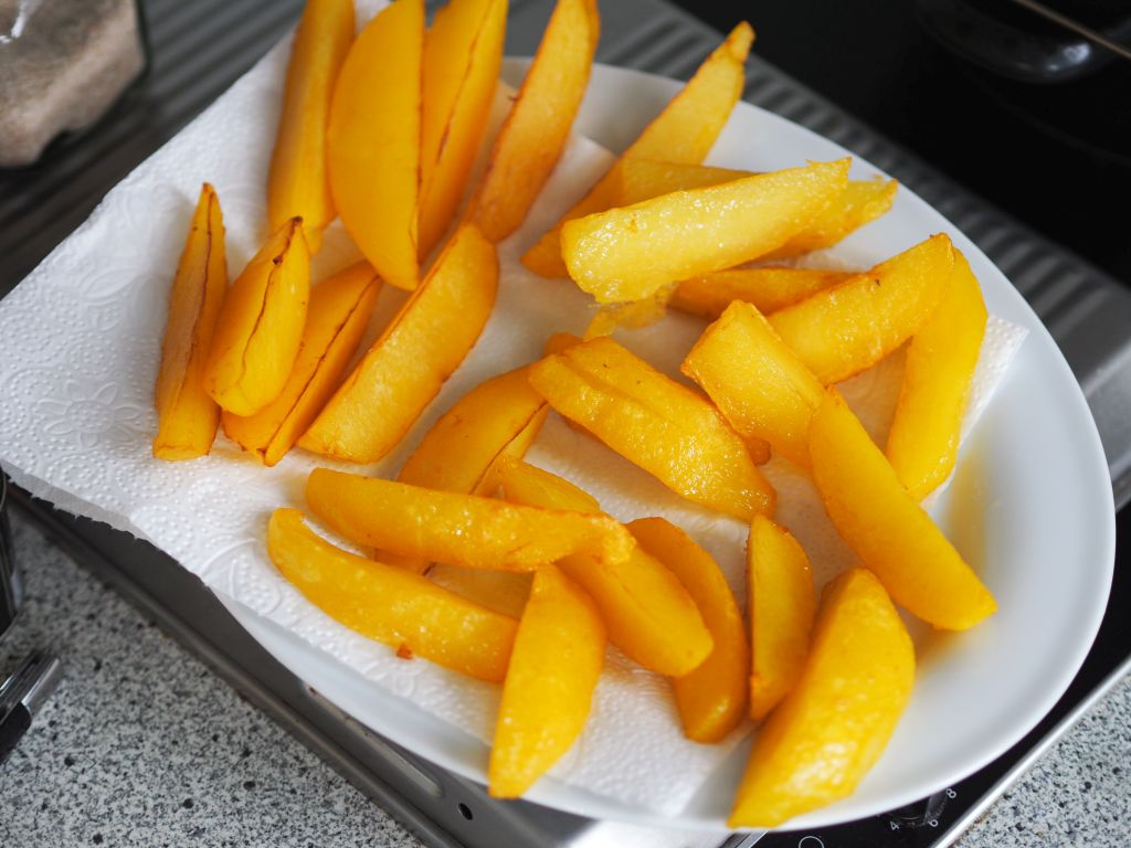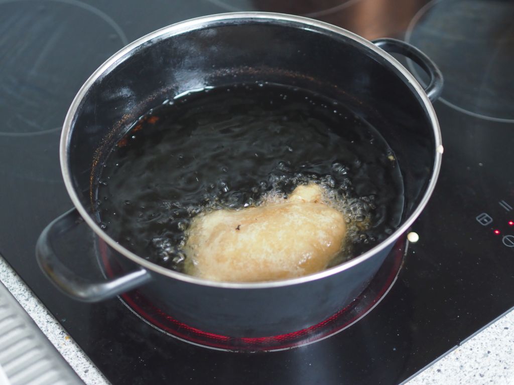 Wir haben die Backfische ohne Frittierkorb frittiert. Ansonsten würde sich der riesige Fisch in den selbigen hineinhängen und wäre nicht mehr davon zu trennen.