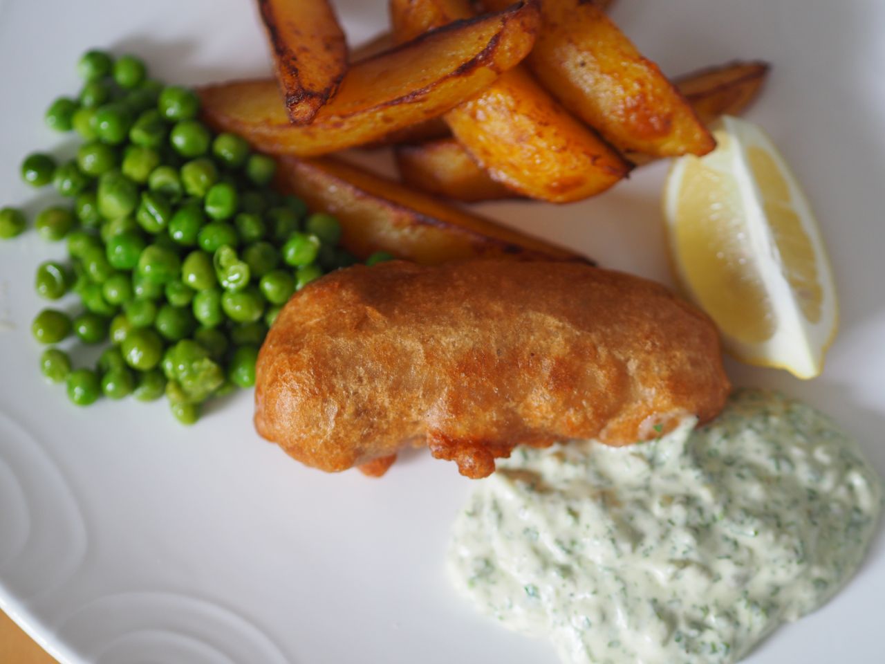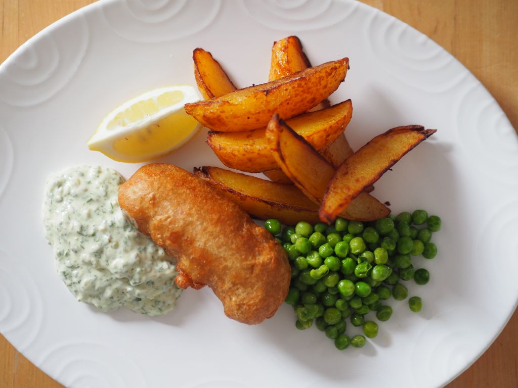 Backfisch mit hausgemachter Sauce Tatar, Kartoffelspalten und Erbsen.