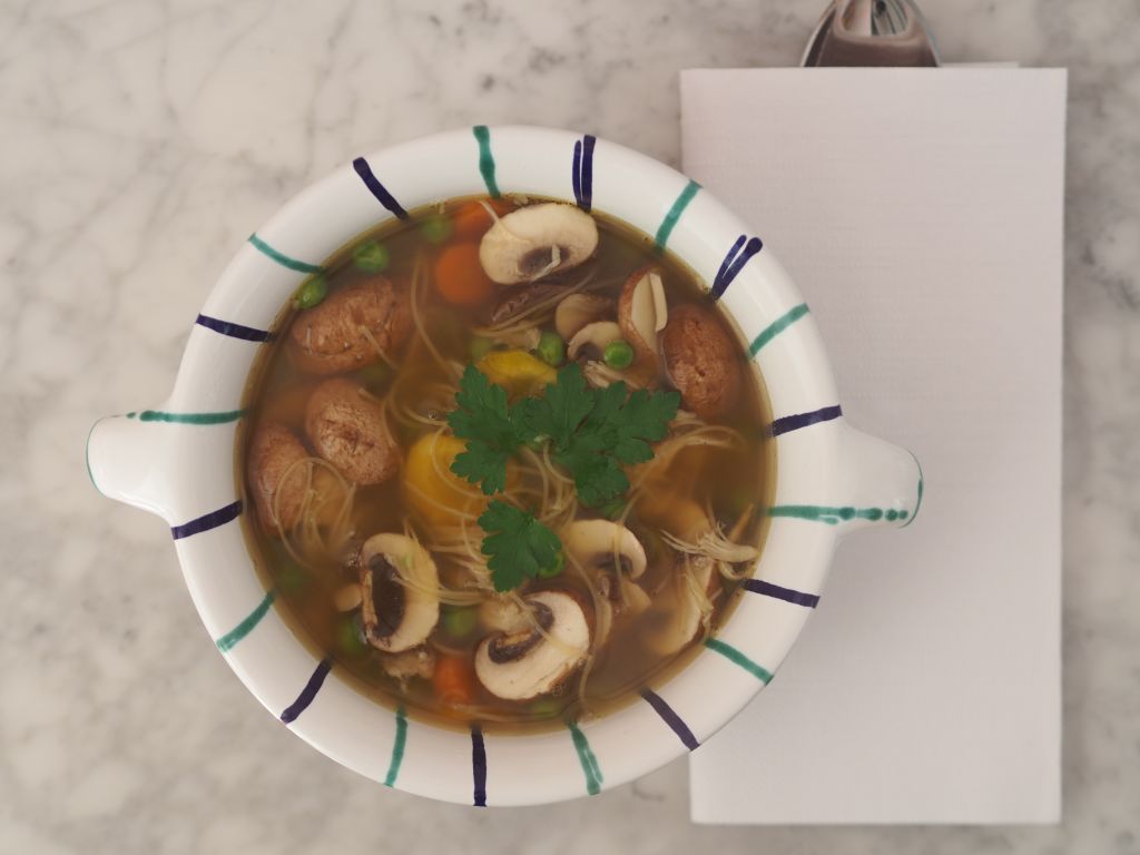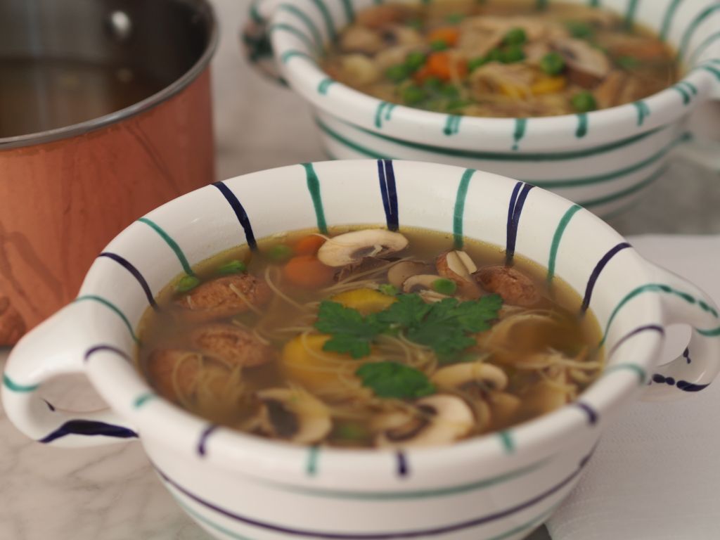 Die Suppe von heute wurde gemacht aus einem Steirerhendl von Gurkerl.at. Die Brust wurde paniert und auf einer anderen Assiette serviert. Fleisch von der Keule und Karkassen sind in die Suppe gewandert. In die Suppe kamen noch Karotten, Champignons, Erbsen und Nudeln. Ist alles vom Gurkerl außer den Nudeln.