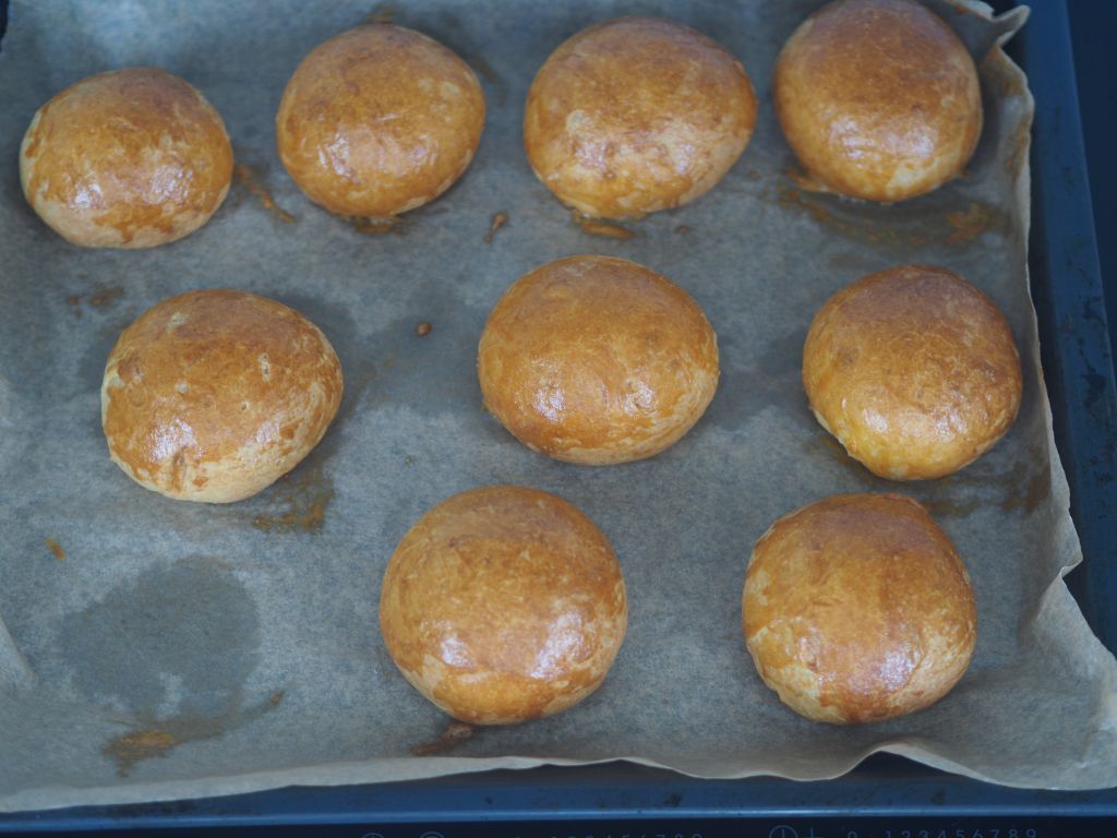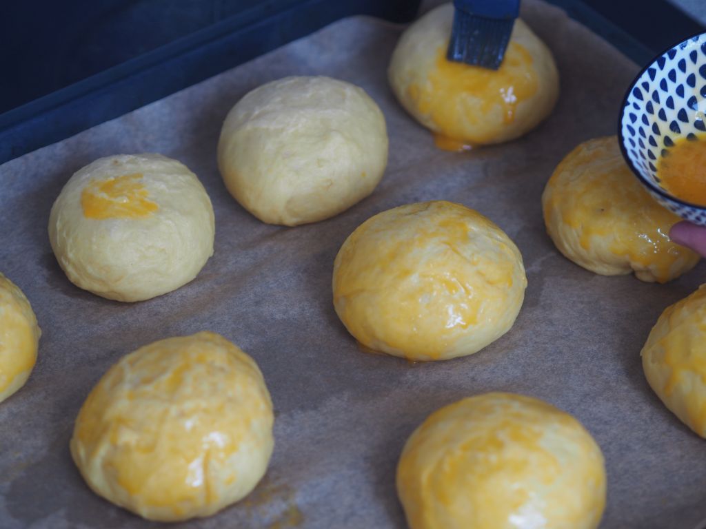 Es bereitet mir zu viel Aufwand, das Rezept vom Brioche hier wiederzugeben. Nur soviel: Es wird ein Dampfl ua. mit Germ und Zucker gemacht, das 20 Min. gehen gelassen wird; dann wird es verknetet, an dieser Stelle wurde der Ruf nach einer KitchenAid laut – und gehen gelassen. ca. 30 Min. Dann wird es in mehrere gleiche Teile geteilt und auf einem Backblech ausgelegt, und eine weiter halbe Stunde gehen gelassen, bis es endlich mit Dotter bestrichen gebacken wird,
