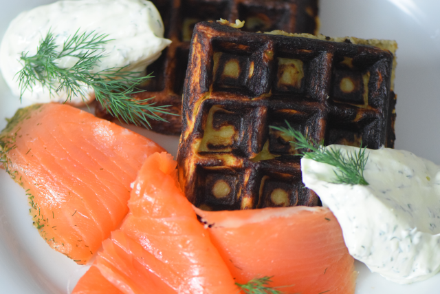 Dies ist das erste Gericht aus einem neu erstandenen Kochbuch: Yves Camdeborde, Simplement Bistrot. Was zur Folge hatte, dass wir uns ein Waffeleisen zulegten. Das Waffeleisen hat sich mittlerweile offenbar in Paris durchgesetzt. Yves Camdeborde ist in Frankreich berühmt für seine „bistronomie“, einem Sammelbegriff für Speisen, die zwischen Bistrot und Restaurant-Gastronomie angesiedelt sind. Sie sind schnell und einfach zuzubereiten, verfügen aber obendrein über das gewisse Etwas. Oft ist es eine Kleinigkeit nur, God is in the detail, oder ist es die geniale Kombination, die das Gericht außergewöhnlich macht. Da muss man sich einfach ein Waffeleisen zulegen. Unseres ist nicht elektrisch, deshalb platzsparend und hat extra tiefe Taschen für den besonderen Wohlgeschmack.