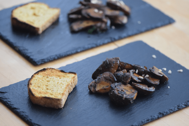 Die zerriebenen Mandeln in der Kräuterbutter könnten bitter werden, weshalb die Umhüllung der Brust mit der Kräuterbutter erst nach dem Anbraten erfolgte.