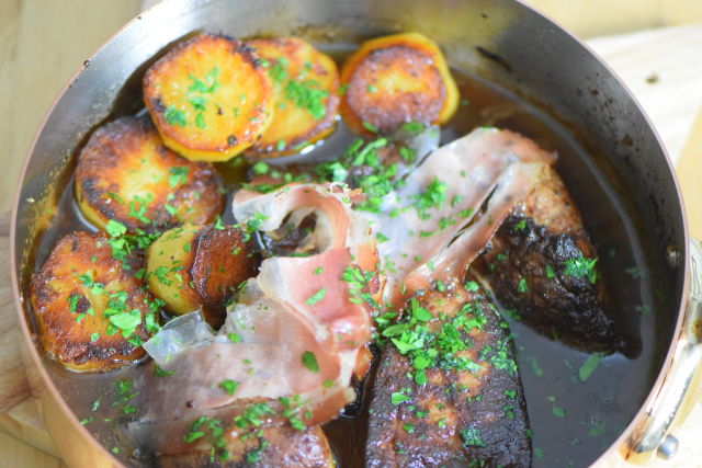 Mit einer Geflügelschere das Perlhuhn tranchieren….. weiter auf S. 462 bei Alain Ducasse « Grand Livre de Cuisine » weltweit genießen, Matthaes, 2009. Das Rezept sparen wir uns, es wäre zuviel Aufwand. Nur soviel: für die Tourte wird ein Zwiebel-Fenchel-Gemüse gemacht, das mit dem gebratenen Perlhuhnschenkeln vermischt wird. Viele Zutaten, aber es lohnt sich: für die Tourte: Zwiebeln, Fenchelknolle, Perlhuhnschenkel, Thymian, Lorbeerblatt, Knoblauchzehe, Chicorée, Butter, Honig zum Karamelisieren. Taggiasche-Oliven, Geflügelfond, Geflügeljus. Die Kräuterbutter wird gemacht mit Petersilie, Koriander, Salbei und gemahlenen Mandeln. Für die Kräuterbutter nur das Beste: Beurre de Bordeaux.