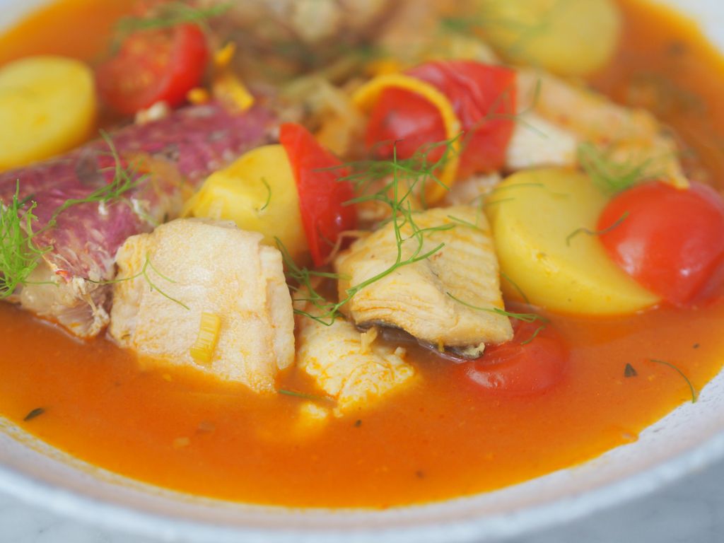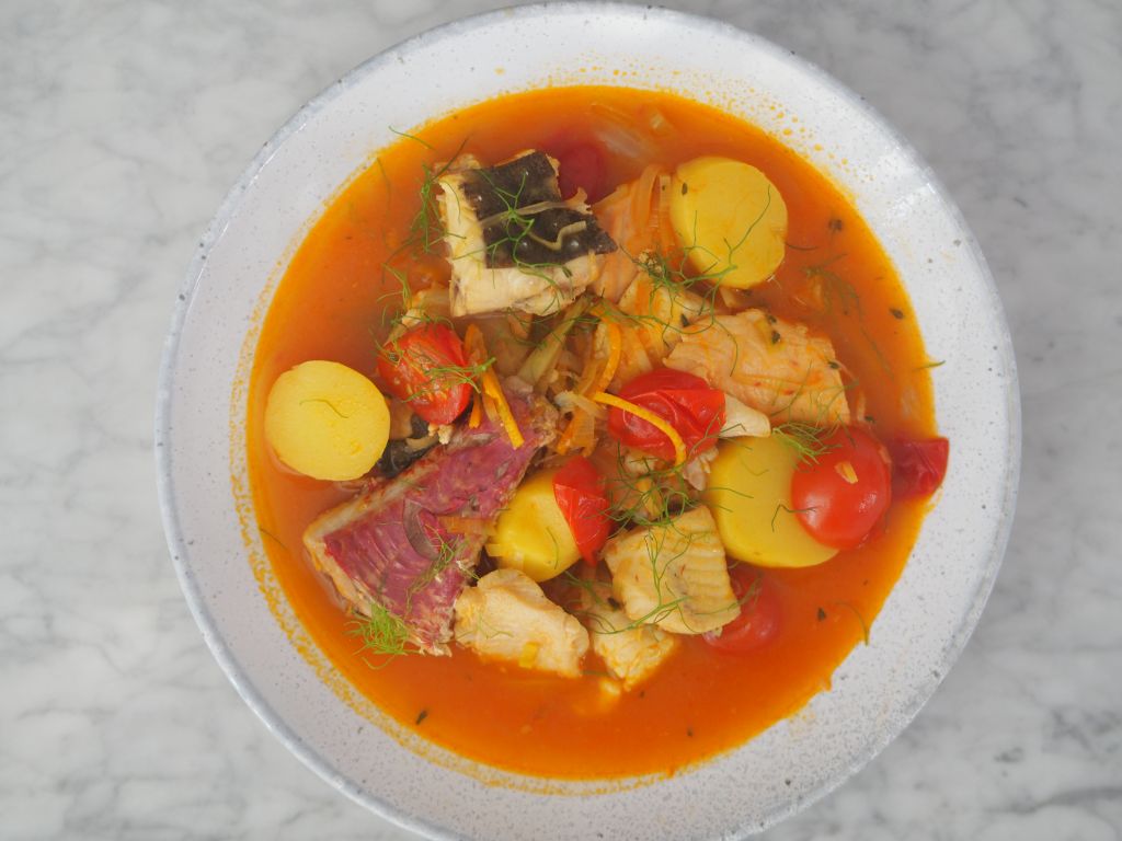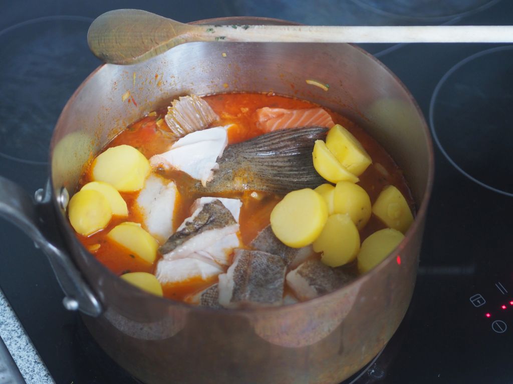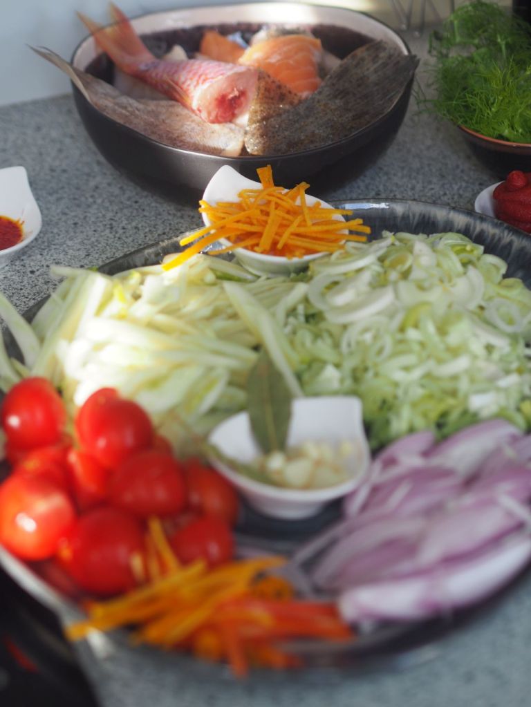 - Am Vortag muß man eine Hühnerbrühe zubereiten… in der Küche eines ordentlichen Restaurants ist die sowieso immer am köcheln, bei uns nur bei Bedarf.