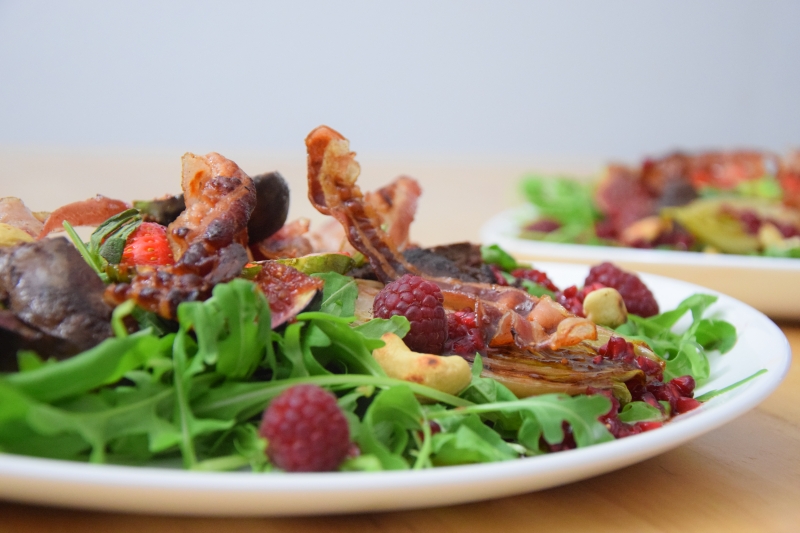 Rucola-Salat mit Feigen, Erdbeeren, Cashewnüssen, Chicorée, Speck und Hühnerleber. Dazu ein Himbeerdressing mit zerdrückten Himbeeren.