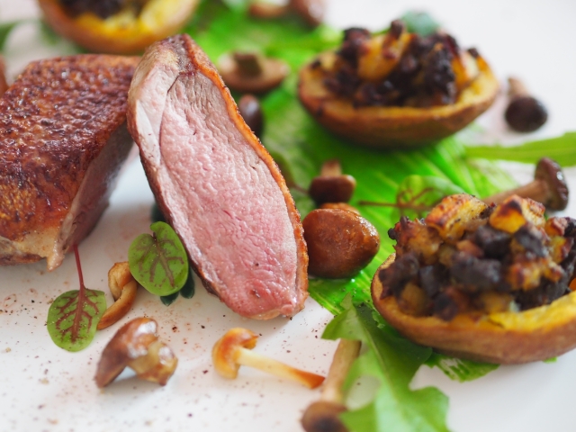 8. Die Entenbrust in dünne Scheiben aufschneiden und auf das Püree legen..