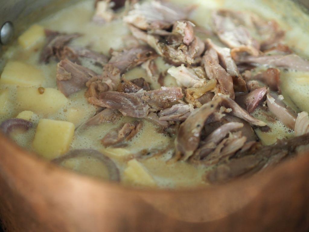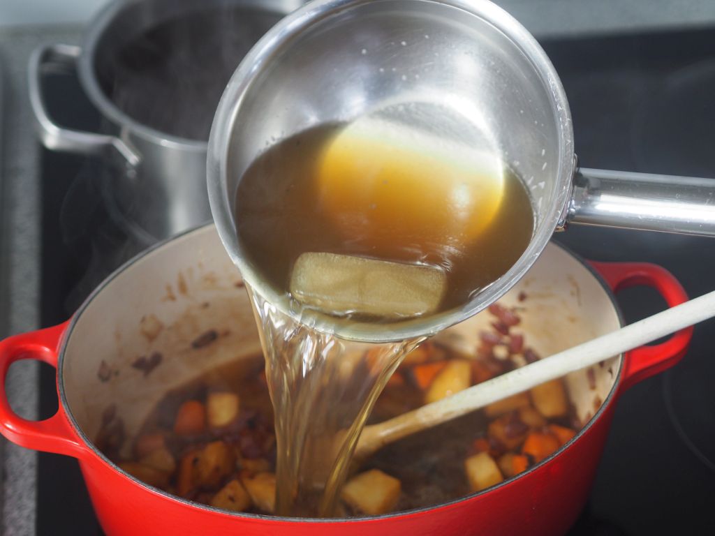 8. Dann das Gemüse, den Speck, die konfierten Entenkeulen, die Wurststücke, den Piment d‘Espelette und die schwarzen Pfefferkörner unterrühren. Hühnersuppe dazugießen.