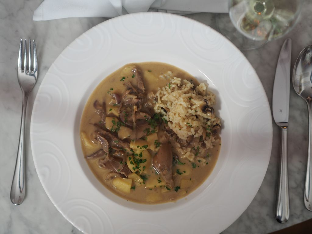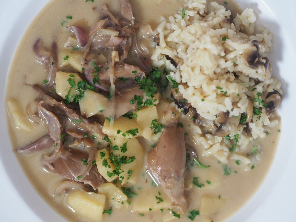 R e z e p t 2 rote Zwiebel, ein Viertel von einer Sellerieknolle und 4 Karotten schälen und in Stücke schneiden. Von den 4 Sousvide gegarten Entenkeulen das Entenschmalz abschaben und mit einem Stück Speck in einer Bratenreine erwärmen. Das Gemüse dazugeben und scharf anbraten. Mit einem Achterl Portwein ablöschen, einköcheln. Mit 700 ml Gemüsebrühe aufgießen. Lorbeerblatt, Zimt und Beifuß dazugeben. Entenkeule in den Sud geben. Abgedeckt, 20 Min. bei 160° in den Ofen schieben. Dann die Entenkeulen aus dem Sud herausheben. S o ß e Den Sud in einen Topf abseihen. 200 ml Schlagobers dazugeben, aufkochen. Für die Mehlbutter: 40 g Butter, 40 g Mehl, mit der Gabel gut verrühren. Mit Mehlbutter binden. – Fleisch von den Knochen abzupfen. 2 rote Äpfel schälen, entkernen und in Stücke schneiden. 3 rote Zwiebel in Scheiben schneiden. Apfel und Zwiebel in die Soße geben und 10 Min. köcheln lassen. Dann das gezupfte Fleisch dazugeben und weitere 10 Min. köcheln lassen. B e i l a g e Champignonreis.