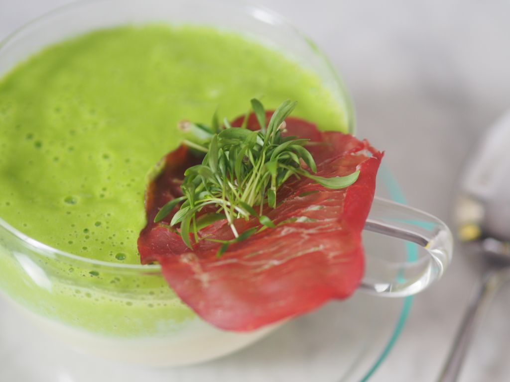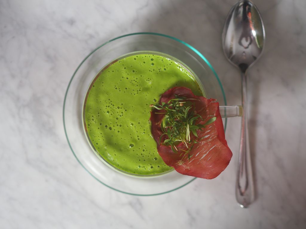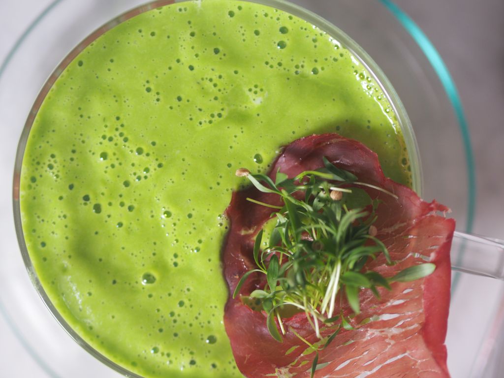 Feingehackte Schalotten und die geschälten und in Stücke geschnittenen Petersilienwurzeln in Olivenöl hell anschwitzen. Mit Gemüsebrühe aufgießen. Weichköcheln. Danach in einem Standmixer total fein pürieren. Die Hälfte aus dem Stabmixer in einen Topf gießen und zur Suppe im Mixer Petersilienblätter geben und nochmal fein pürieren, damit es schön cremig wird, von der Petersilie bekommt es nun eine grüne Farbe. Diese in einen anderen Topf umschütten. In beide Töpfe Schlagobers dazugießen, mit Salz und weißem Pfeffer abschmecken. A n r i c h t e n zuerst die weiße Suppe in einen Teller gießen, die grüne Suppe mit dem Stabmixer aufschäumen und vorsichtig auf die weiße Suppe mit einem Schöpflöffel geben. Mit Bündnerfleisch und Korianderkresse kredenzen.