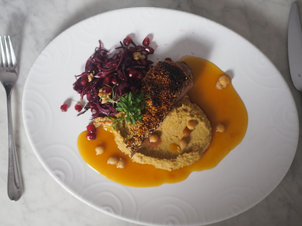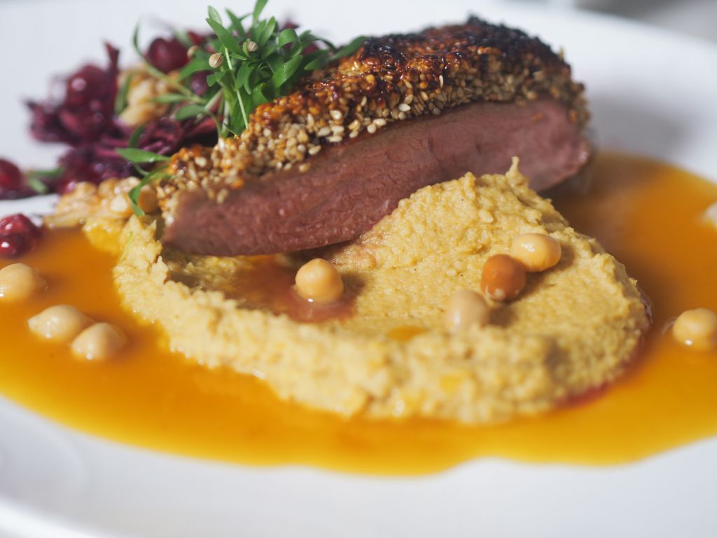 Ente in Sesamkruste mit Rotkrautsalat und Kichererbsenpüree
