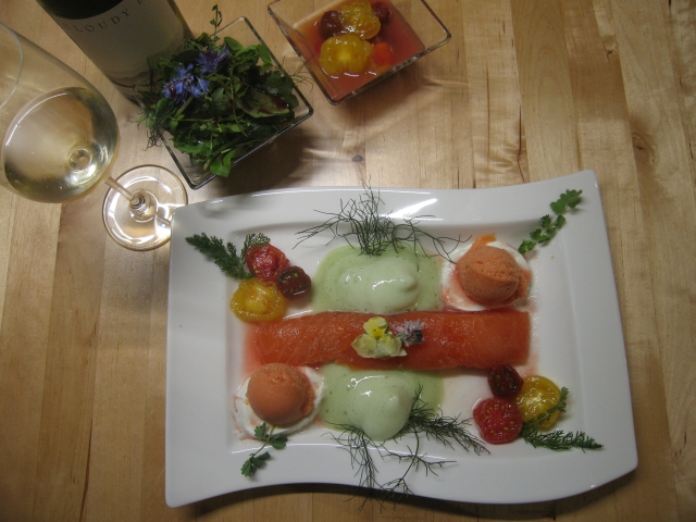 Lachs geht mit der Tomate gerne eine kulinarisch harmonische Kombination ein. Hier kommt eine Kombination mit nur gebeiztem aber ansonsten nicht gegarten Lachsfilet mit verschiedenen Tomatentexturen zur Vollendung. Weil grad Tomatenzeit ist.