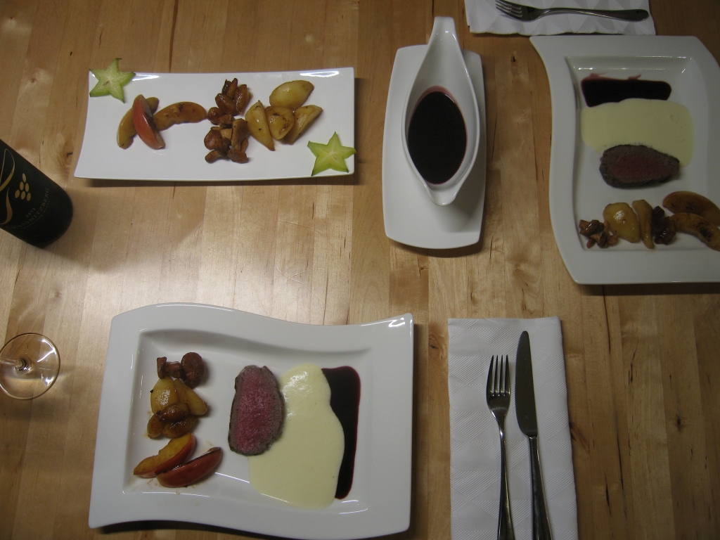 … und glacierten Äpfel, Perlzwiebel und Birnen – und Eierschwammerl mit Holundersauce. Wer das nicht kennt …