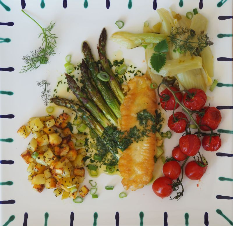 Die zerriebenen Mandeln in der Kräuterbutter könnten bitter werden, weshalb die Umhüllung der Brust mit der Kräuterbutter erst nach dem Anbraten erfolgte.