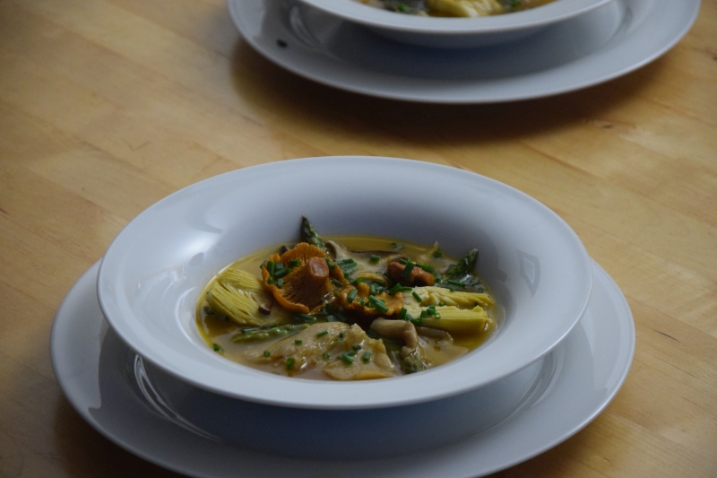 Diese Pilzsuppe ist eine Gemüsesuppe mit verschiedenen Arten von Pilzen, darunter Kräuterseitlingen, die so geschnitten sind, dass sie den Anschein erwecken, Nudeln zu sein. Aber, es ist alles paletti paleo.