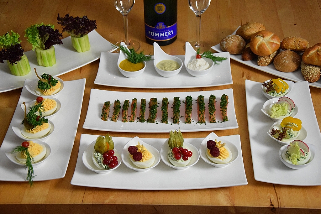 mit Wasabi-, Kren-, Kräutertopfen- und Eiaufstrich, garniert mit Physalis, Johannisbeeren und Himbeeren dazu Gurkentürmchen.