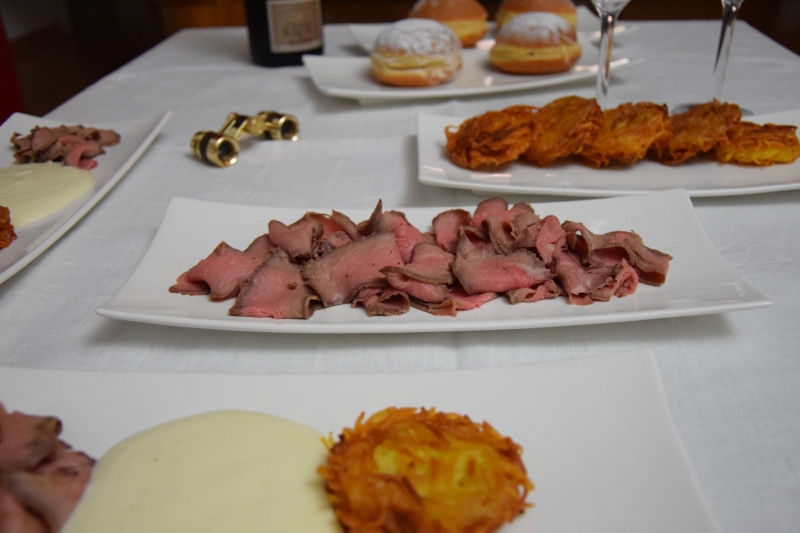 mit Roastbeef, Kartoffelpuffer und Kren-Espuma.