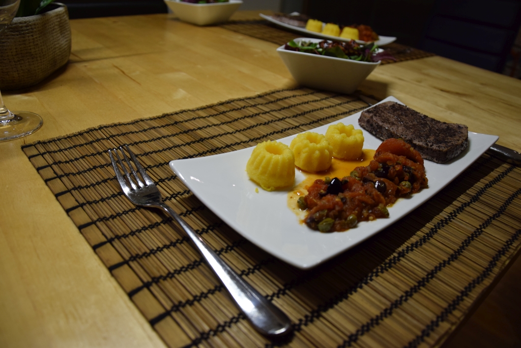 … mit süß-saurer Tomatensauce und Polenta. Der Thunfisch wird nur 30 Sekunden auf jeder Seite angebraten.