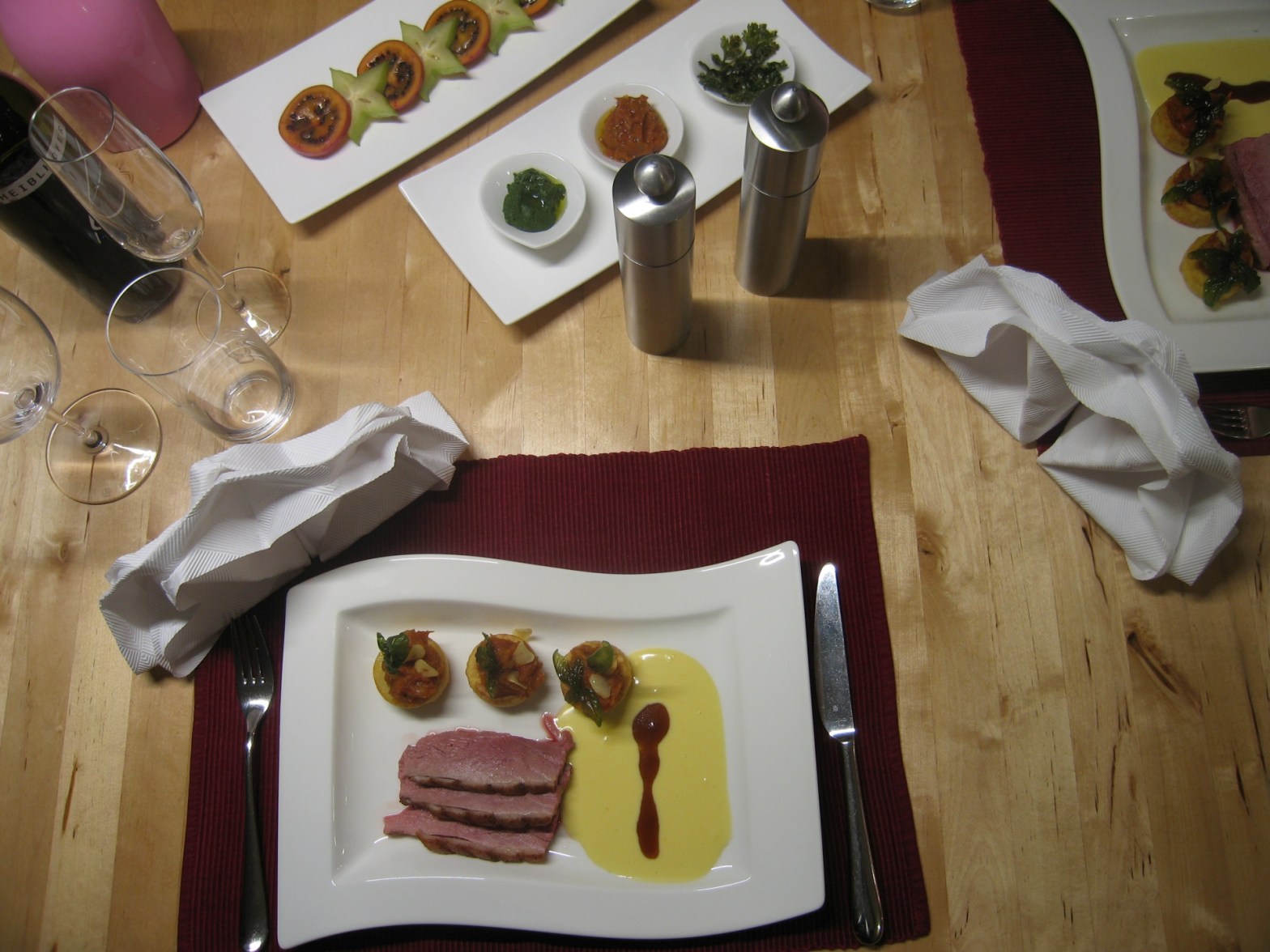 bestehend aus Barbajuans, Iberico-Kotelett mit Patatas bravas, karamellisierten Perlzwiebeln und grünem Salat, Apfelzimttorte, Birnenmandeltorte, typisch australisch halt.