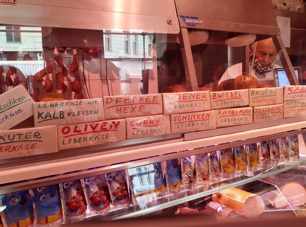 So viele Leberkäsesorten! Da lacht das Wiener Herz. Ganz rechts ist sogar normaler Leberkäse! Was es alles gibt…