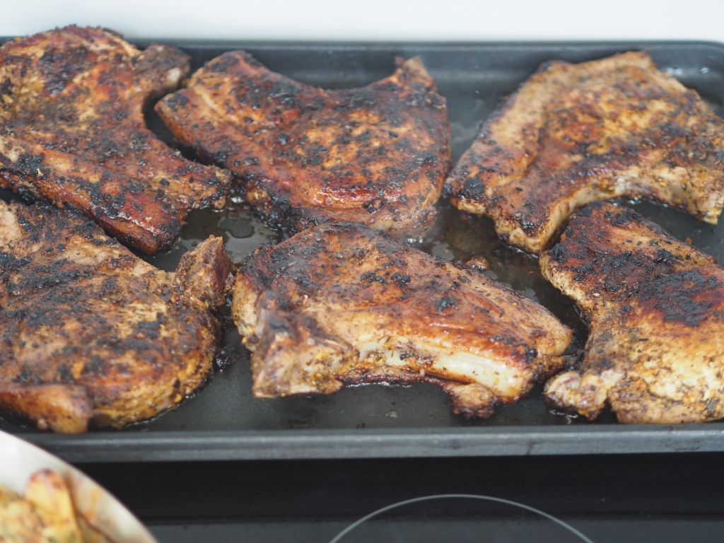 Die Schweinskoteletts hatten alle Platz in der großen Bratpfanne von Wolf.