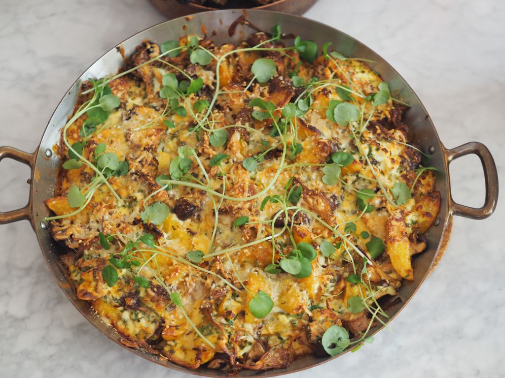 Pilze-Kartoffeln al forno Zwiebel in Scheiben schneiden, geschälte Kartoffeln in Spalten schneiden, mit Salz, Pfeffer, Olivenöl und gepresstem Knoblauch gut vermischen. In die Paellapfanne geben und etwa eine Dreiviertelstunde im Backrohr braten. Austernpilze, Champignons und Kräuterseitlinge putzen und in grobe Stücke schneiden. Mit Olivenöl und Salz zusammenmischen. Kartoffeln aus dem Ofen nehmen, die Pilze darunter heben und eine Mischung aus geschlagenem Ei, Frischkäse und gehacktem Schnittlauch darüber gießen. Mit gehobelten Parmesanspänen bestreuen und weitere zwanzig Minuten ins Backrohr schieben. Anrichten: Mit Brunnenkresse bestreuen.