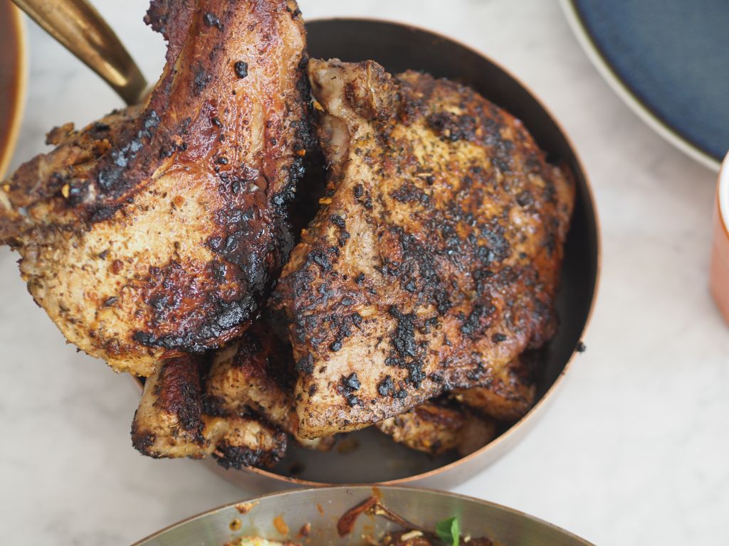 Schweinskoteletts Die Gewürzmischung Füszerkeverék (Pastinaken, Zwiebel, Thymian, Paprikapulver, Karotte, Knoblauch, Majoran, Oregano, Koriander, Thymian, etc.) mit Olivenöl vermischen, das Fleisch damit schön marinieren und zwei Stunden ziehen lassen. Die Koteletts in die Pfanne geben. In der großen Grillpfanne von Wolf haben alle sechs Schweinskoteletts Platz gefunden. Auf beiden Seiten braten.
