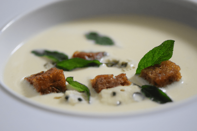 Selleriesuppe mit Schaf-Roquefort und frittierten Salbeiblättern, eine warme Wintersuppe. Doch bevor einem zu warm wird, gibt es ein kühlendes Getränk dazu: Selleriebirnensaft mit Ingwer und Estragon eiskalt serviert.