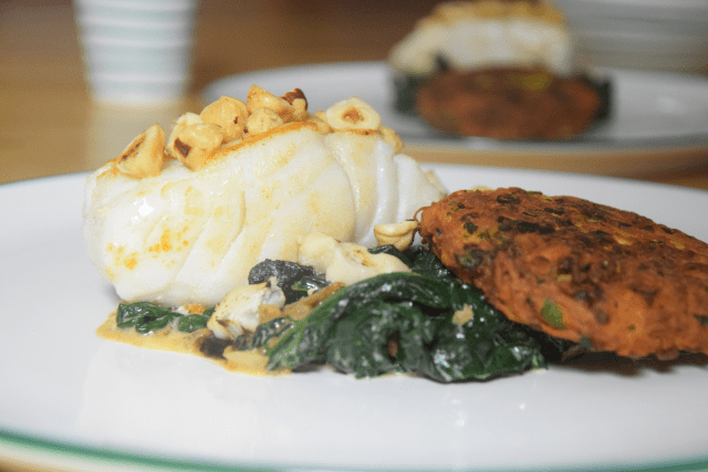 Statt Pommes Frites gibt es Légumes Frites. Und statt Mayonnaise gibt es eine katalonische Quitten-Aioli, dazu Mangold-Salat. Fast Food als Delikatess‘.