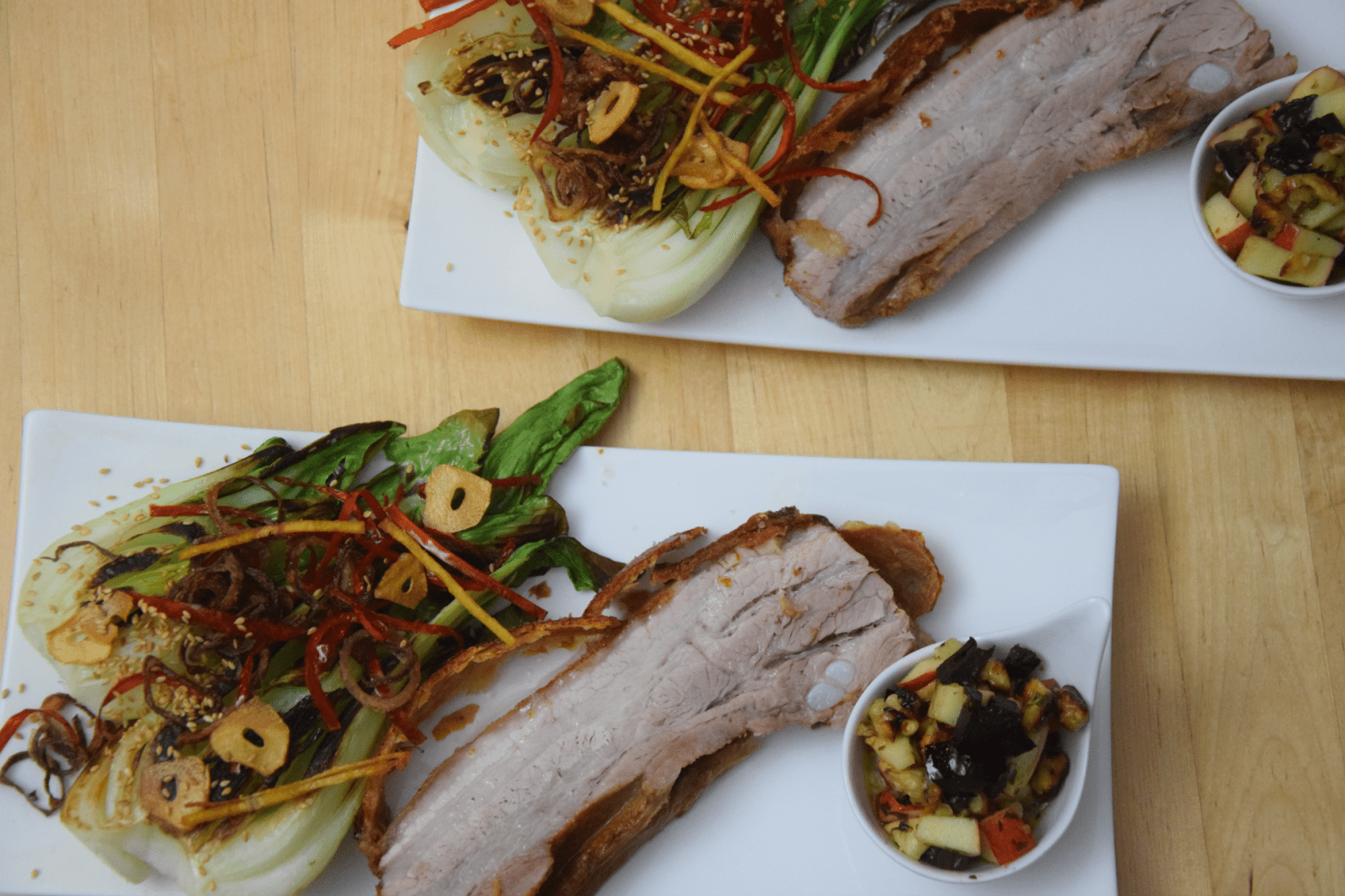 Ein knuspriger Schweinebauch aromatisiert durch Ingwer und Chili, dazu ein erfrischendes Apfel-Walnuss-Salsa und einen gebratenen Pak Choi, bestreut mit Sesam.