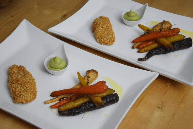 Hähnchenschnitzel mit einer Panier aus Cashew-Kernen und Mandeln. Eine Creme aus Avocado und Wasabi. Dazu konfierte rote, gelbe und lila Karotten.