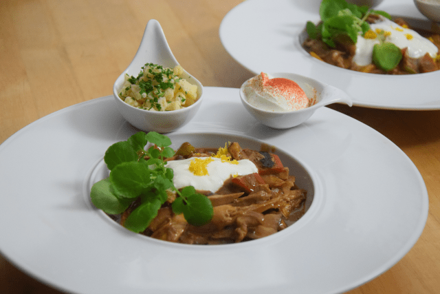 Weil es uns so gut geschmeckt hat, kommt noch eine „geschmort & gezupft“-Variante von Alexander Herrmann. Dieses Mal gibt es das Hühnerfrikassee als Gulasch, da kommen ordentlich Paprika rein. Dazu Spätzle.