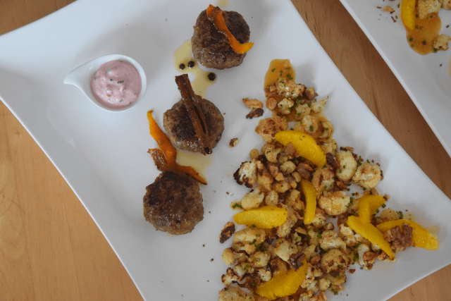 Hirschfrikadellen mit Preiselbeerschmand und Blumenkohlsalat