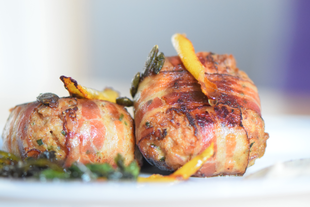 Die Schweinsfrikadellen werden mit Frühstücksspeck ummantelt, dazu kommen geröstete Kürbiskerne. Als Beilage gibt es eine Mayonnaise mit grobkörnigem scharfem Senf.
