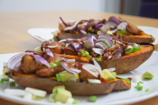 Die Süßkartoffel wird im Backrohr gegart, halbiert und wie ein Brötchen belegt: mit Avocado, Frühlingszwiebel und gebratenen Hähnchenstücken. Darüber wird eine BBQ-Sauce geträufelt. Das geht schnell. Die BBQ-Sauce haben wir selber macht. Das hat zwar Zeit gekostet, aus geschmacklichen Gründen haben wir uns dennoch dazu entschlossen.