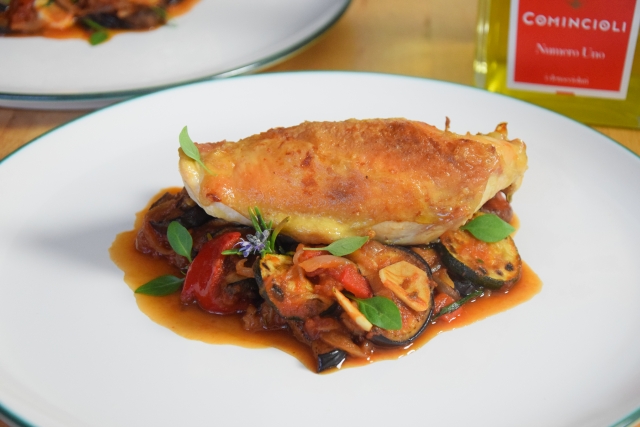 Ein Ratatouille mit diesem saftigen Hähnchen, leicht knusprig, ist an sich schon ein Genuß. Noch besser schmeckt es aber mit Veronelli-Olivenöl.