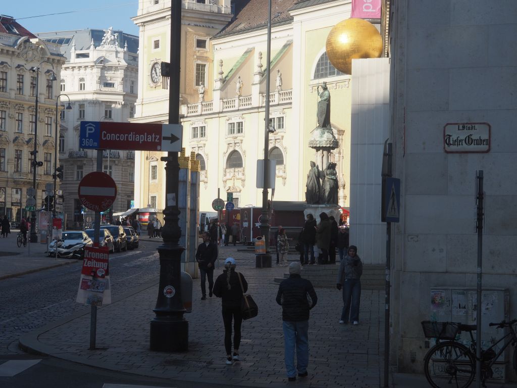 Da wir anschließend zu einer Geburtstagsfeier eingeladen waren, fiel die Heimfahrt mit dem Taxi aus. So eilten wir durch das Gewurl am Michaelerplatz, dort kam uns ein festentschlossener Kamikaze-Radfahrer entgegen. Danach kam das Geschiebe zum Stillstand. Wir beschlossen, auf die andere Straßenseite zu wechseln, um dem Stau zu entgehen und verloren uns kurzfristig.