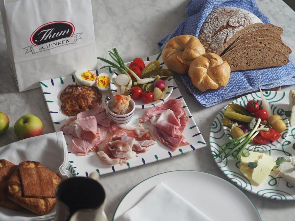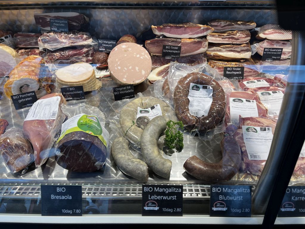 Eine gut aufgelegte Küchenfee wünschte einem Mann ein herzhaftes „Mahlzeit“! Er stand hinter uns und aß eine Leberkässemmel aus dem Papierl, während er darauf wartete, bis wir endlich unseren Einkauf beim Käse beendeten. Dann ging es weiter zum Thum. „I siech solche Sachen sofort“, sagte die Küchenfee und meinte das “Grammelschmalz da hinten“, wovon Fräulein J. auch ihrem Papa mitnahm. Weiters deckten wir uns ein mit Mangalitza-Beinschinken, Sacherwürsteln, ausgelösten Schopf vom Mangalitza. Beim Einpacken machte eine Tasche ein Hoppala und fiel zu Boden, doch nicht auf die Butterseite, nichts passiert.