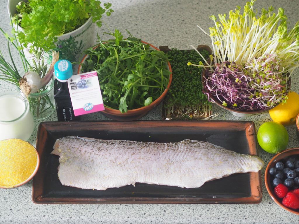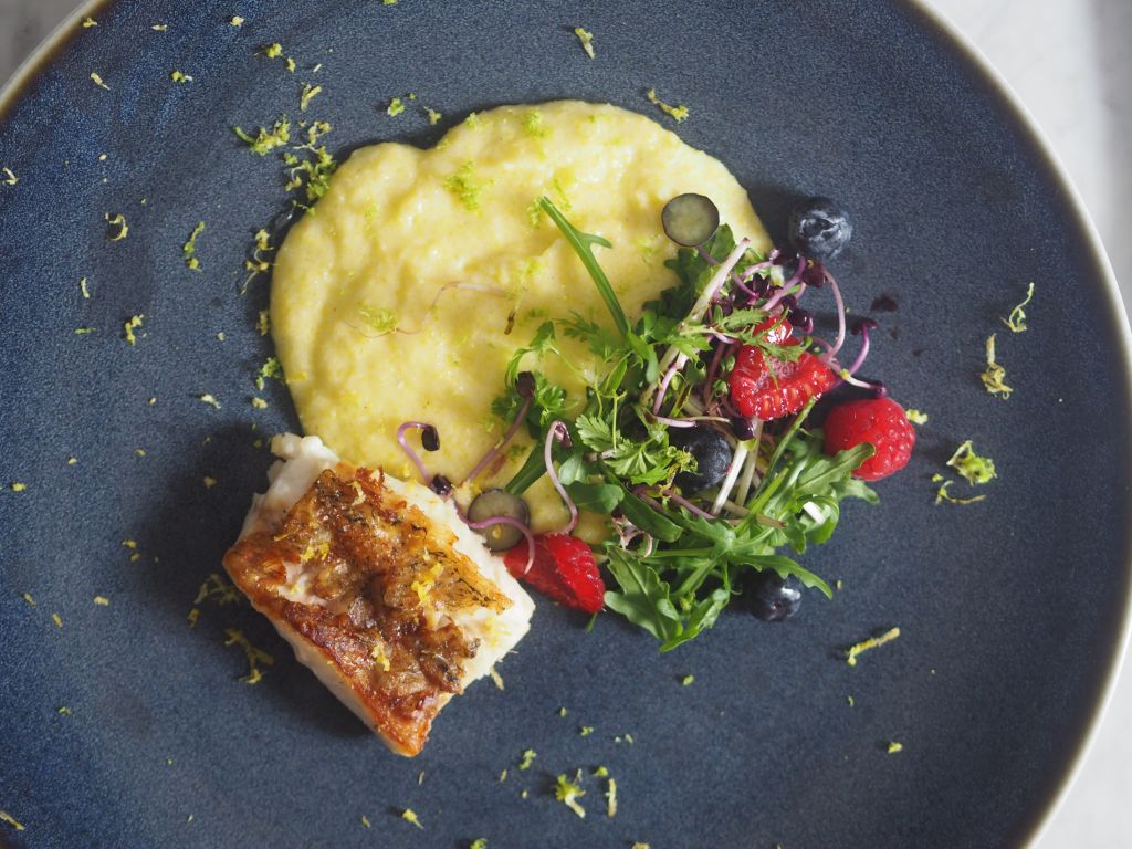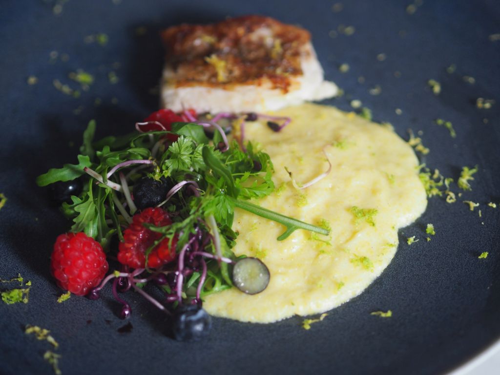Hechtfilet mit Limettenpolenta, Sprossensalat und Beeren