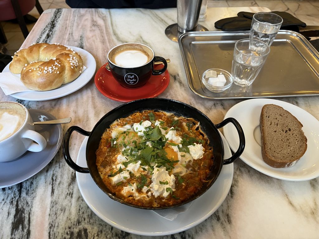 Das Frühstück nahmen wir diesmal im Café Diglas in der Wollzeile ein, dessen Namensgeber mit dem Casino Zögernitz in Döbling verbunden ist, dort wo nämlich Johann Strauß Vater und Sohn am Wochenende aufgeigten. Im Café Diglas selbst war Franz Lehar regelmäßig zu Gast aber auch Karl Farkas und Heimito von Doderer. Ob es die israelische Eierspeise Shakshuka damals schon auf die Speiskarte geschafft hat, darf bezweifelt werden, ich war jedenfalls hocherfreut, sie deroselbst dort vorzufinden; die Küchenfee nahm ein „schnelles Diglas-Frühstück“, was bedeutete, ein Briochekipferl und eine Melange. Wir saßen in der Nähe der Eingangstür. Das machte aber nichts, da durch einen Windfang die Kälte am Eindringen in den Gastraum abgehalten wurde. Das funktionierte recht gut, bis auf ein paar wenige Ausnahmen, die es zustande brachten, die beiden doch relativ weit auseinander stehenden Türen gleichzeitig offen zu halten.