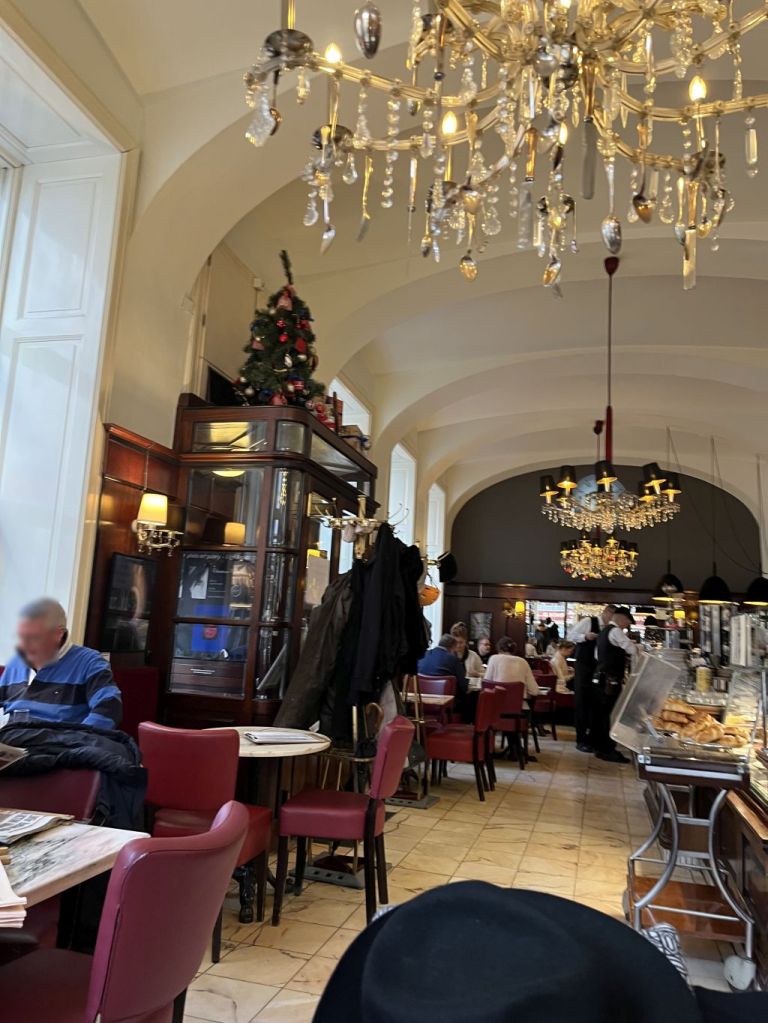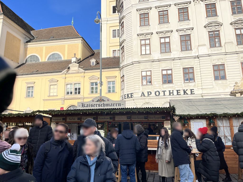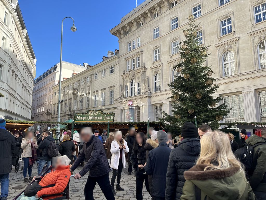 Wien am 8. Dezember, Maria Empfängnis. Zuerst waren wir in der Albertina. Beim Christkindlmarkt auf der Freyung gab es Brote mit Blutwurst, Speck und Schmalz. Wir konnten uns nicht entscheiden und so wurden durchprobiert: Beerenpunsch, Pfirsichpunsch, Amarettopunsch, Glüh-Aperol und Uhudlerpunsch. Dann zum Aufwärmen ins Beaulieu im Palais Ferstel, einem Bistro mitten in Wien.